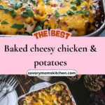 A hearty and comforting baked dish featuring juicy chicken breasts, tender roasted potatoes, and a golden layer of melted cheese.