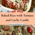 This recipe is wonderfully hands-off, relying on the oven to do most of the work. The confit method gently coaxes sweetness from the tomatoes and garlic while keeping everything soft and luscious. Baking the rice ensures perfectly fluffy grains every time, with no sticking or stirring required. It’s versatile, reheats well, and feels special enough for guests while still being easy enough for everyday cooking.