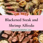 A rich and restaurant-quality surf-and-turf pasta featuring tender blackened steak, juicy shrimp, and a smoky, creamy Alfredo sauce tossed with penne for a bold and comforting meal.