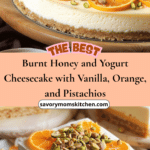 Burnt Honey and Yogurt Cheesecake with Vanilla, Orange, and Pistachios is a refined dessert that showcases contrast in flavor and texture. With its creamy interior, crisp nutty crust, and caramelized finish, it’s a memorable centerpiece for gatherings or a luxurious treat to enjoy slowly.