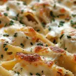 Tender jumbo pasta shells stuffed with a cheesy chicken filling, topped with creamy garlic Alfredo sauce and baked until bubbly for a comforting, crowd-pleasing meal.