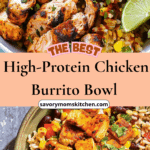 This high-protein chicken burrito bowl combines seasoned chicken, cilantro-lime rice, black beans, corn, fajita veggies, guacamole, and cheese into a hearty, flavorful, and macro-balanced meal that’s perfect for meal prep or quick dinners.