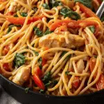 This Chicken Spaghetti is a creamy, comforting pasta dish made with tender chunks of chicken, sautéed peppers and onions, and perfectly cooked spaghetti tossed in a rich, cheesy sauce with a subtle hint of chili spice. It’s a quick weeknight dinner that delivers big flavor using simple, wholesome ingredients.