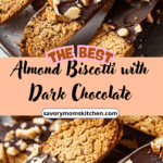 Crisp, flavorful almond biscotti dipped in smooth semi-sweet chocolate and sprinkled with almonds. These Italian cookies are crunchy yet balanced, perfect with coffee or as a holiday treat.
