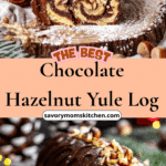 This Chocolate, Hazelnut & Caramel Yule Log is a festive showstopper that brings together light-as-air chocolate sponge, silky salted caramel whipped cream, crunchy hazelnuts, and a luscious dark chocolate ganache. It’s a beautifully rolled dessert that looks impressive, yet is surprisingly manageable to make—even for non-experts. This is my go-to centerpiece for any holiday celebration.