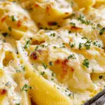 Creamy Chicken Alfredo Stuffed Shells filled with juicy shredded chicken, ricotta, cottage cheese, and herbs, all baked in a rich homemade Alfredo sauce. A comforting, hearty pasta dish perfect for weeknights, gatherings, or make-ahead meals.