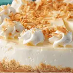 When you take a classic cheesecake and infuse it with tropical coconut flavor — from the crust to the filling to the topping — you get a dessert that’s creamy, rich, and utterly irresistible. This cheesecake layers a buttery cookie-coconut crust with a silky coconut-enhanced cheesecake filling, and finishes off with fluffy coconut whipped cream and a shower of toasted coconut for crunch.