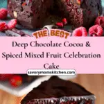 Deep Chocolate Cocoa & Spiced Mixed Fruit Celebration Cake brings together rich cocoa, warming spices, and sweet bursts of dried fruit in one unforgettable dessert. It is festive without being heavy, elegant without being complicated, and perfect for marking life’s most meaningful moments. Bake it for a celebration, a holiday table, or simply to create a memory worth savoring.