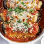 Tender roasted eggplant slices rolled with a creamy cheese filling and baked in a savory tomato sauce for a comforting and elegant dish.
