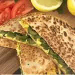 This Mediterranean-inspired breakfast quesadilla combines scrambled eggs, feta, green olives, and arugula inside a warm whole-grain tortilla. Served with optional tahini sauce, it’s a satisfying and nourishing way to start the day.