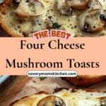 Four Cheese Mushroom Toasts are crispy slices of bread layered with a creamy cheese blend and savory herb-seasoned mushrooms, baked until golden and bubbling. A simple yet gourmet appetizer or light meal.