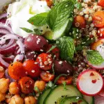 A fresh, hearty Mediterranean quinoa salad made with roasted tomatoes, feta, olives, herbs, and chickpeas, tossed in a zesty dressing. Perfect as a side dish or a satisfying main meal.