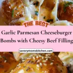 Savory garlic parmesan cheeseburger bombs filled with juicy beef and melted cheese, wrapped in soft dough and baked to golden perfection—perfect for snacks, parties, or a fun meal.