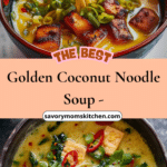 Golden coconut noodle soup is a warming, vibrant dish made with creamy coconut milk, fragrant spices, and tender rice noodles, topped with crispy tofu, fresh vegetables, and herbs for a nourishing and satisfying meal.