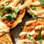 This grilled eggplant dish is rich with smoky, spicy, and creamy flavors. Tender eggplant halves are brushed with a harissa glaze, roasted or grilled to perfection, then topped with a zesty tahini sauce, crunchy nuts, and fresh herbs. A stunning vegetarian main or side.