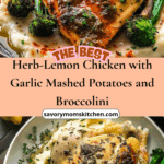 A bright and flavorful plate of herb-lemon seared chicken served with creamy garlic mashed potatoes and tender broccolini. A quick yet elegant 30-minute meal perfect for any occasion.