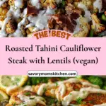 A hearty plant-based meal featuring golden roasted cauliflower steaks coated in a creamy tahini herb sauce, served over tender lentils simmered in vegetable broth and herbs for a nourishing and flavorful dinner.
