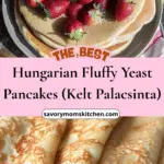 Traditional Hungarian yeast pancakes that are soft, lightly airy, and golden. Kelt Palacsinta has a gentle rise from yeast, creating a delicate fluffiness while remaining tender and flexible—perfect for sweet fillings like jam, cocoa, cottage cheese, or chocolate spread.