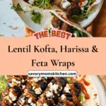 These lentil kofta, harissa and feta wraps are a quick, Middle Eastern-inspired vegetarian meal featuring crispy lentil patties, creamy harissa mayo, fresh lettuce, and tangy feta in warm tortillas.