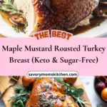 A tender roasted turkey breast coated with garlic herb butter and finished with a sweet and tangy sugar-free maple mustard glaze, creating a juicy and flavorful keto-friendly main dish.