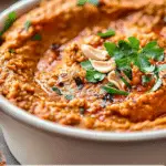 Muhammara is a bold, savory Levantine dip made from roasted red peppers, toasted walnuts, pomegranate molasses, and warm spices. It’s a rich, tangy, and slightly smoky spread perfect for mezze platters, sandwiches, and snacking with warm pita.