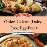 This rustic onion galette features a flaky olive oil crust filled with caramelized red and white onions, all without dairy or eggs. It’s a plant-based, savory tart perfect for dinner or a special occasion.