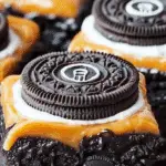 I love how the layers bring contrast: a dense, chewy brownie base; a cream‑cheese–style middle or frosting layer; and crunchy Oreo texture throughout. I also enjoy decorating them for Halloween — adding candy eyes, orange drizzle, or spooky touches makes them festive and fun to serve.