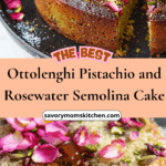 This Ottolenghi Pistachio and Rosewater Semolina Cake is a fragrant, nutty, and moist dessert with Middle Eastern and Mediterranean influences. The semolina gives it a unique texture, while pistachios, almonds, cardamom, lemon, and rosewater create layers of aromatic flavor, finished with a sweet floral syrup.