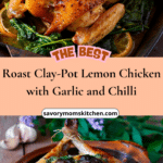 Juicy, steam-roasted lemon chicken with tender garlic cloves, gentle heat from chilli, and a bright lemon-mustard pan juice that’s perfect for spooning over everything. Cooking it in a covered clay pot keeps the meat succulent, then finishing uncovered crisps the skin beautifully.
