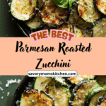 I plan on 4 servings. Prep takes about 5 minutes, and cook time is about 10 minutes (5 minutes roast + 2–3 minutes broil, with a little wiggle room). If I’m feeding hungry friends, I double the recipe and use two pans so the zucchini can stay in a single layer.