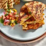 These rotisserie chicken quesadillas are crisp on the outside, melty in the center, and packed with fresh flavor from a bright corn pico de gallo and creamy cilantro sauce. They come together quickly, making them perfect for a casual lunch, easy dinner, or shareable snack for family and friends.