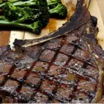Slice steak off the bone and cut against the grain. Serve on a board with baked potatoes and broccolini. Garnish and serve immediately.