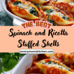 Spinach and Ricotta Stuffed Shells are a comforting vegetarian pasta dish featuring jumbo shells filled with a creamy blend of ricotta, mozzarella, Parmesan, and sautéed spinach, baked in marinara sauce until golden and bubbly.