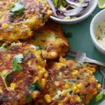 Sweetcorn fritters with sweet chilli dip are crispy on the outside, tender on the inside, and full of fresh flavors from corn, chilli, and coriander. Served with a tangy yoghurt dip and crunchy rainbow slaw, they make a vibrant, satisfying meal or appetizer.