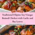 A classic Filipino braised chicken dish simmered in a savory, tangy soy-vinegar sauce with garlic, bay leaves, and spices, resulting in tender, flavorful meat.