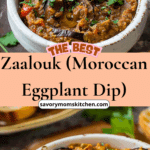 Zaalouk is a Moroccan roasted eggplant and tomato dip or salad, flavored with garlic, olive oil, and warm spices. It’s smoky, creamy, and versatile—perfect as a dip with bread or as a side dish alongside grilled meats.